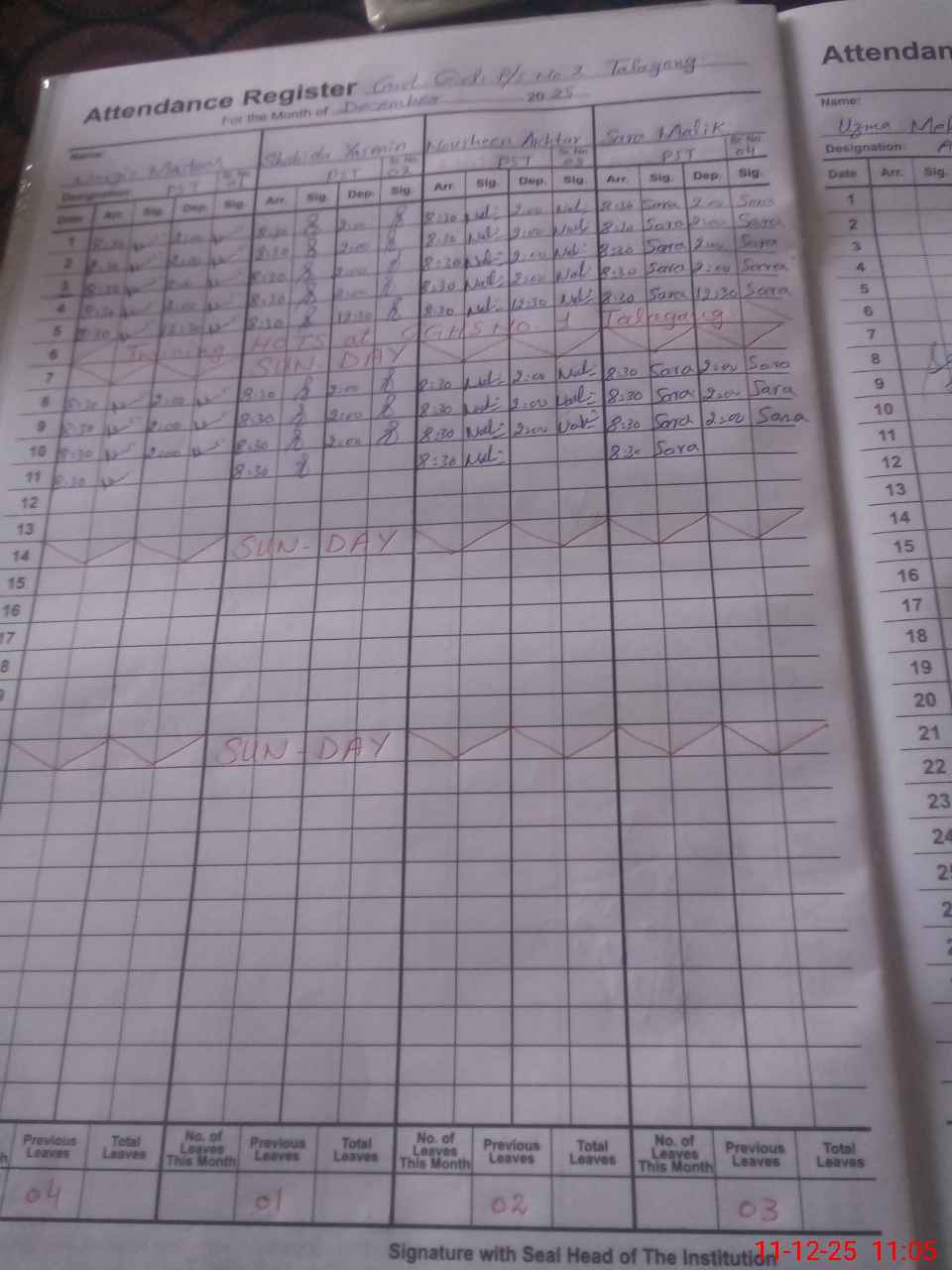 | CNIC | Full Name | Designation | R/C | Absence During Last Calender Month |