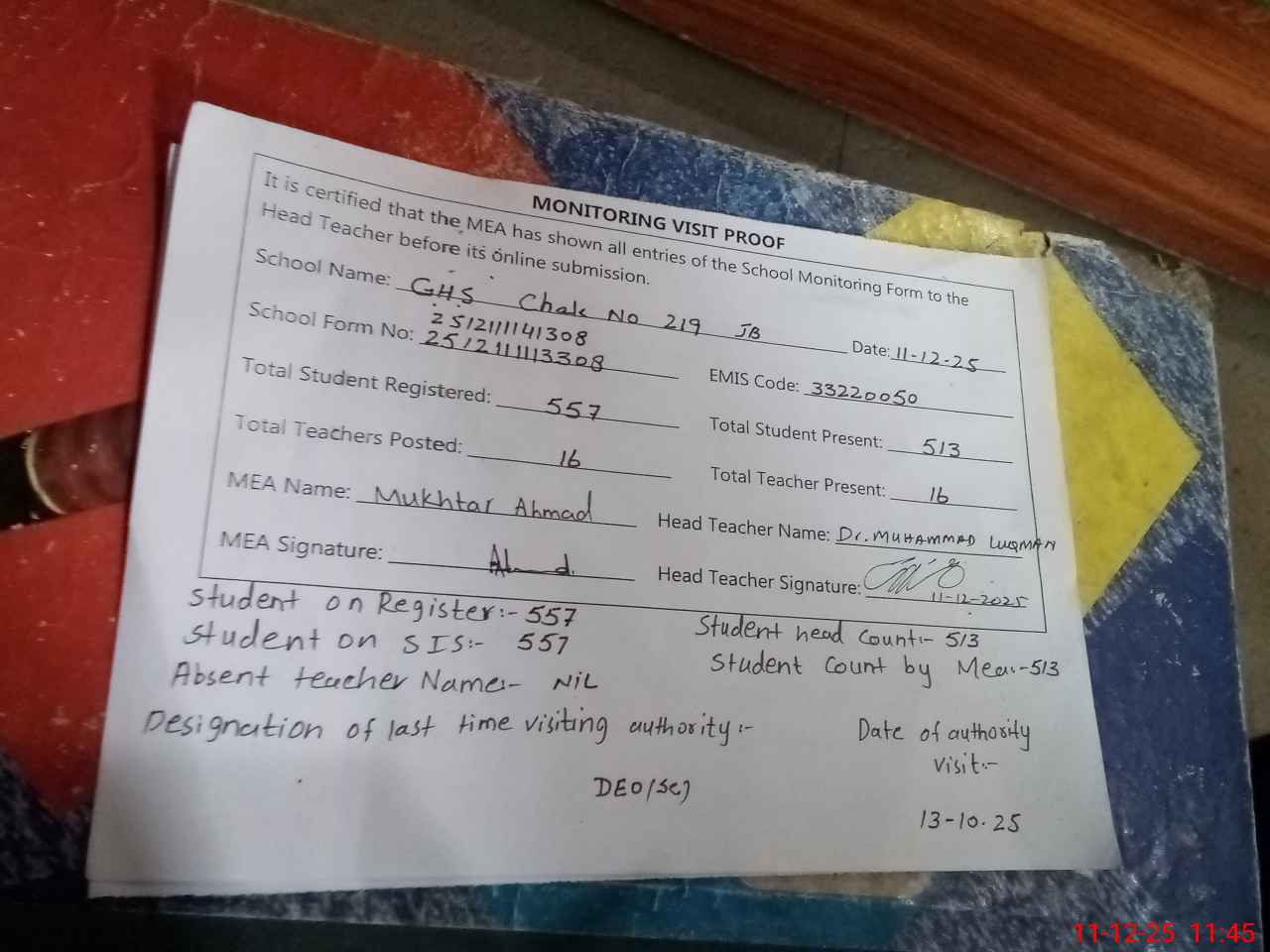 | Attendance Register | Head Teacher | MEA with School | Visit Proof |