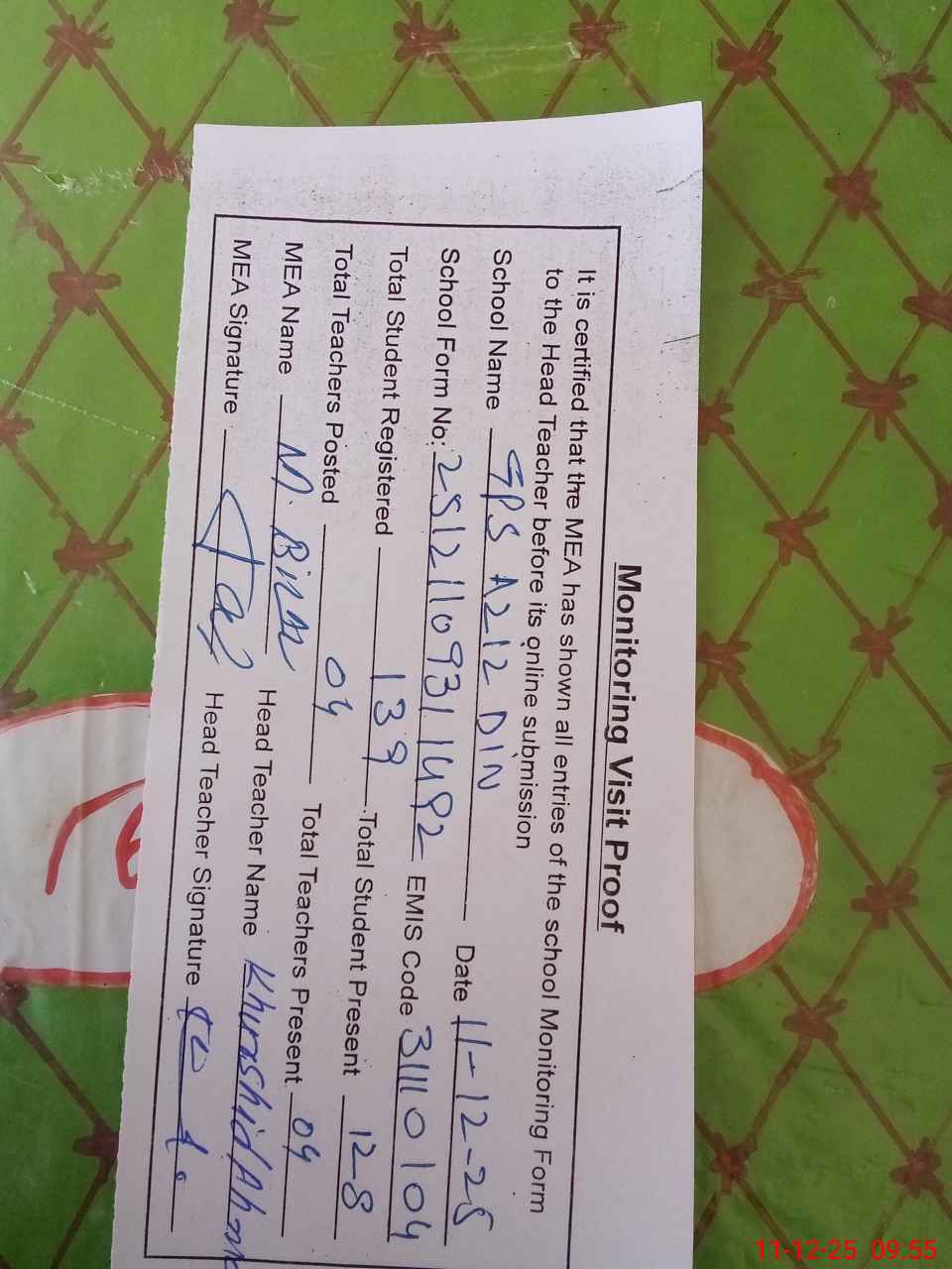 | EMIS Code: 31110104 | Name of School: GPS AZIZ DIN | |||