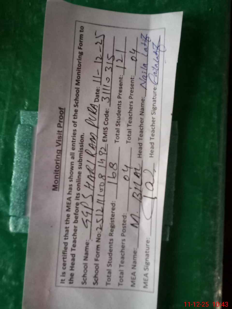 | Attendance Register | Head Teacher | MEA with School | Visit Proof |