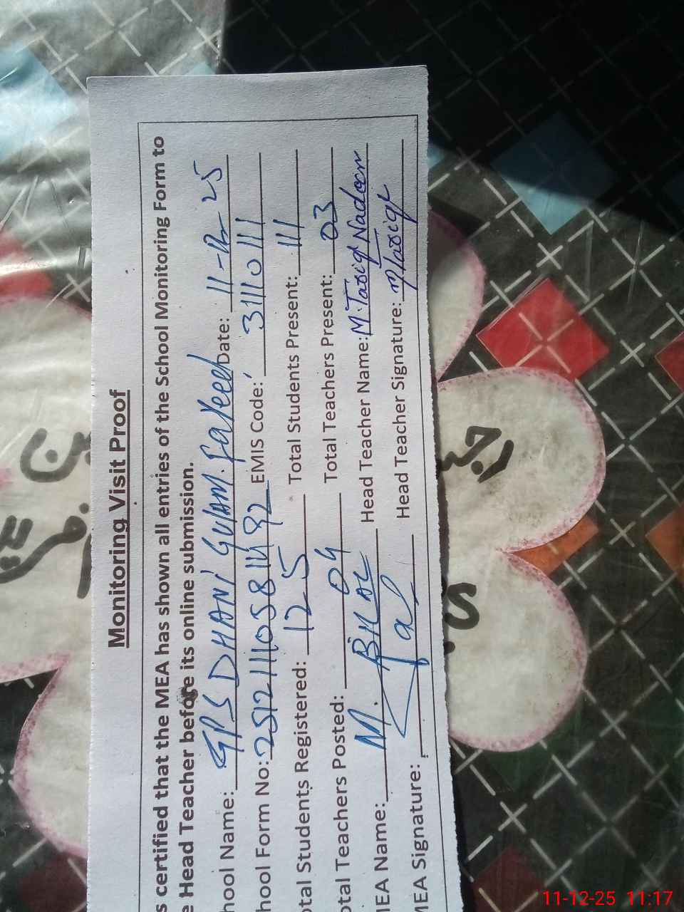 | Attendance Register | Head Teacher | MEA with School | Visit Proof |