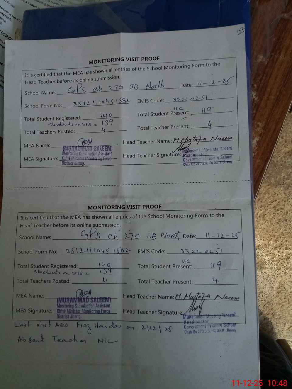 | Attendance Register | Head Teacher | MEA with School | Visit Proof |