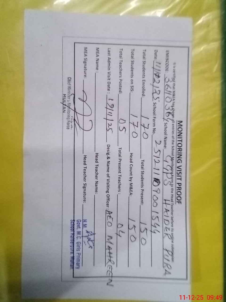 | EMIS Code: 36110364 | Name of School: GGPS MC HAIDER PURA | |||