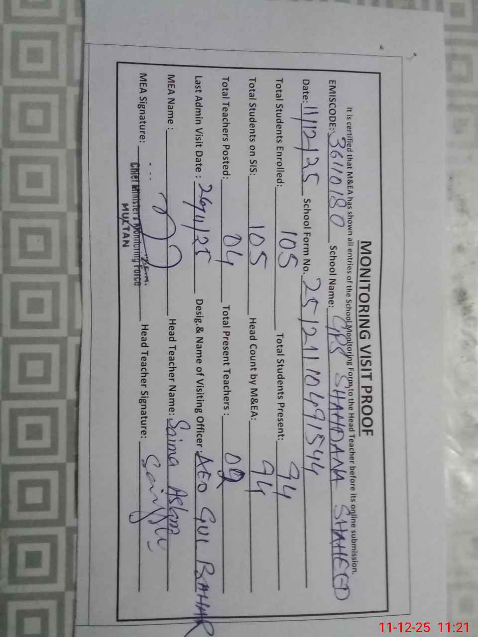 | Certified that this School was Inspected by the Undersigned MEA/DMO Today and the Information Stated Above is as Per Record. | |||||