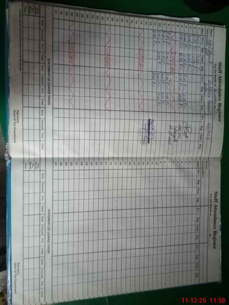 | CNIC | Full Name | Designation | R/C | Absence During Last Calender Month |