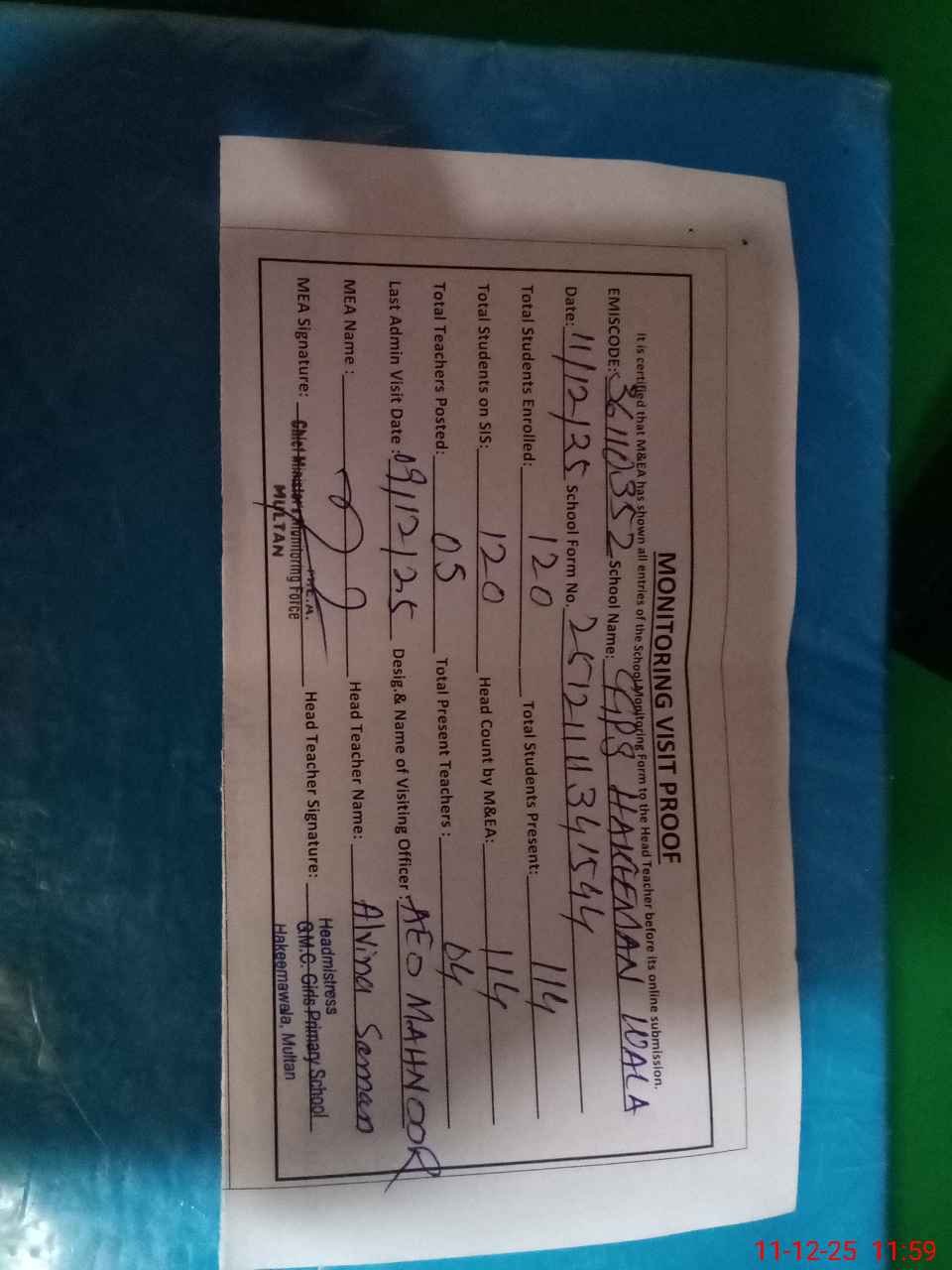 | Attendance Register | Head Teacher | MEA with School | Visit Proof |