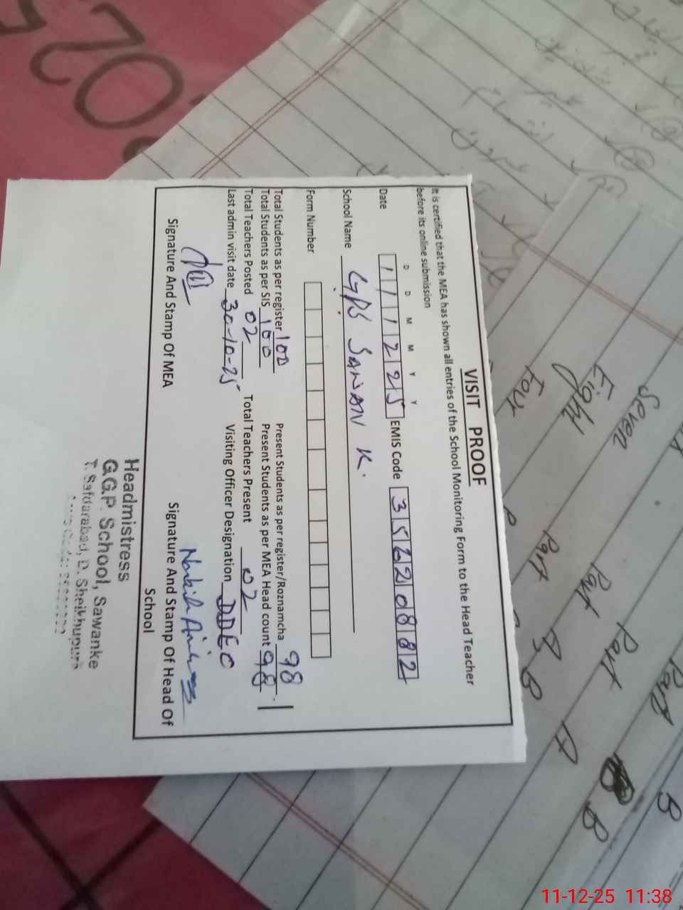 | Attendance Register | Head Teacher | MEA with School | Visit Proof |