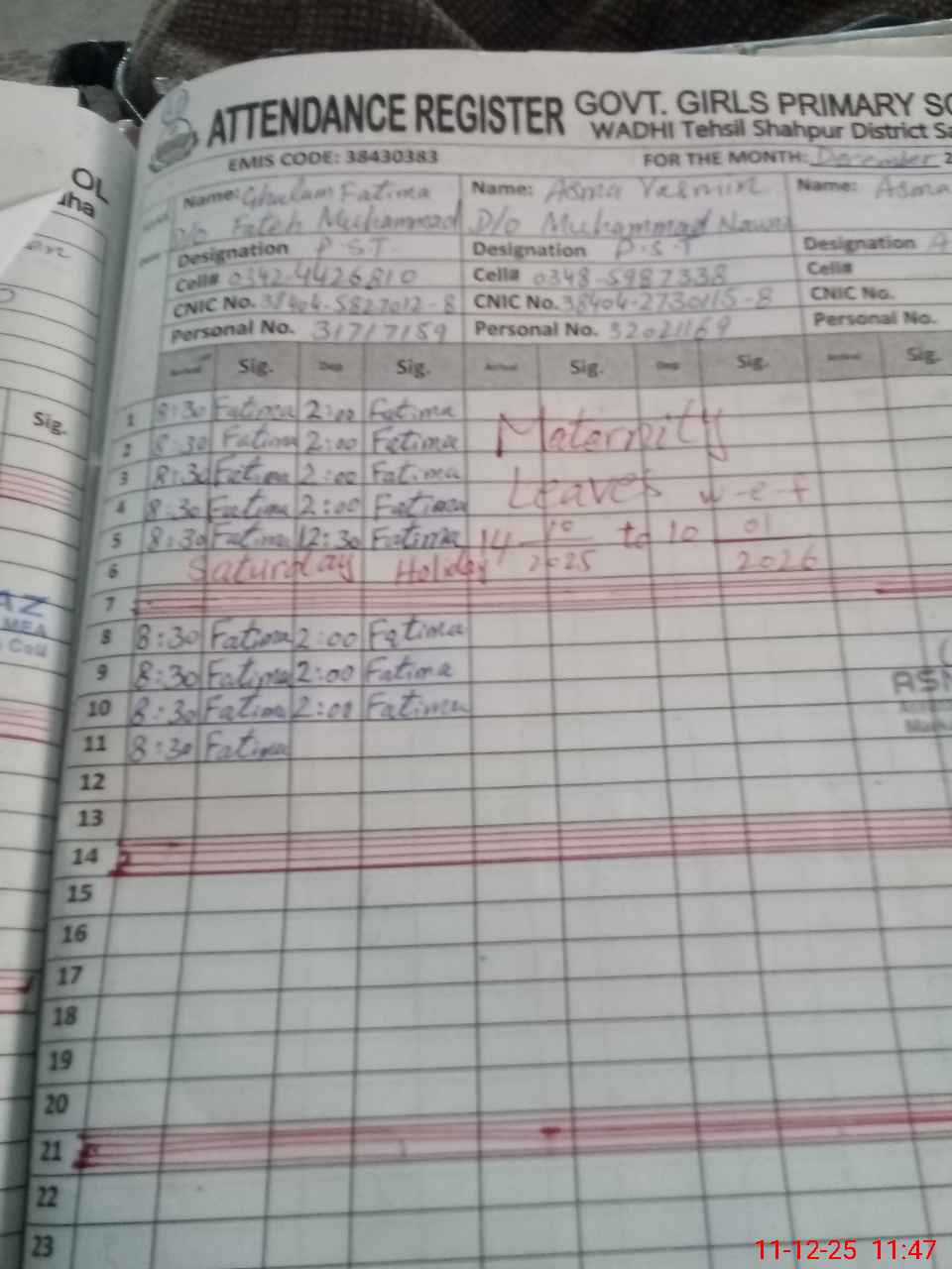 | 38**** | As**** Ya**** | Regular | 30 | 0 | 0 | 30 | 0 | 0 | 0 | 0 | 0 | Maternity | |