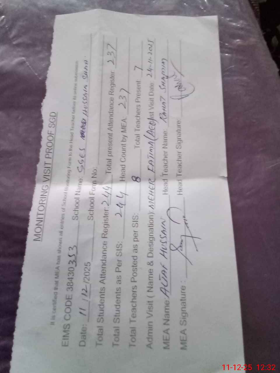 | Attendance Register | Head Teacher | MEA with School | Visit Proof |