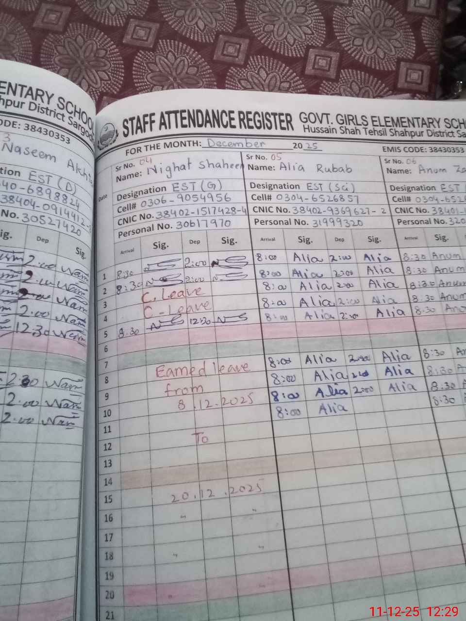 | CNIC | Full Name | Designation | R/C | Absence During Last Calender Month |