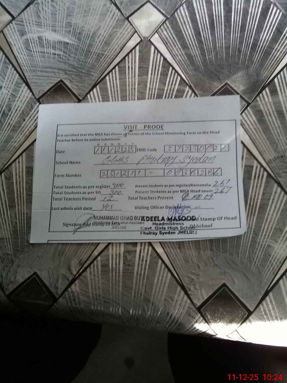 | Certified that this School was Inspected by the Undersigned MEA/DMO Today and the Information Stated Above is as Per Record. | |||||