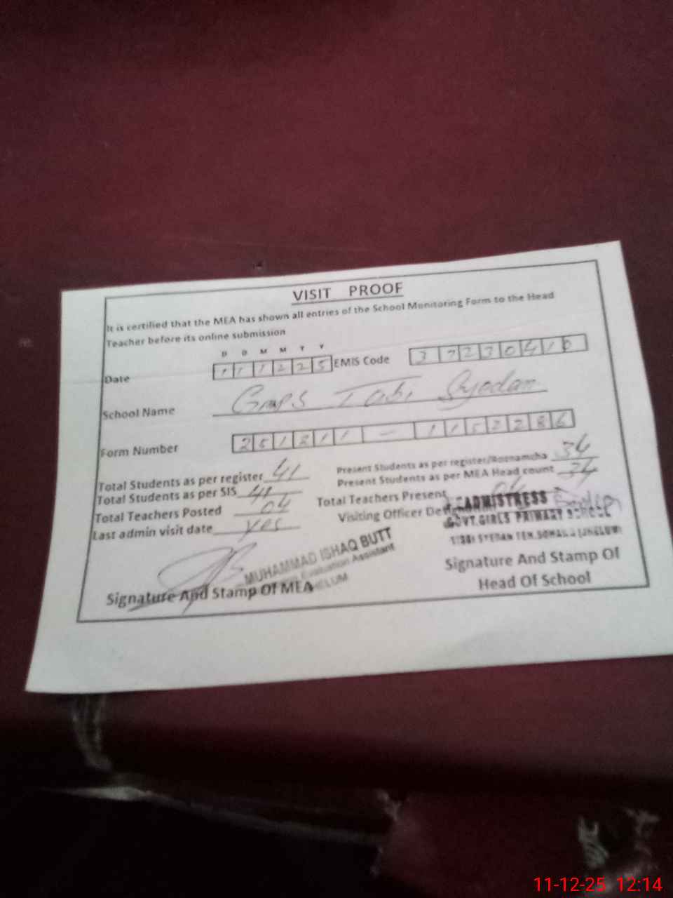 | Attendance Register | Head Teacher | MEA with School | Visit Proof |