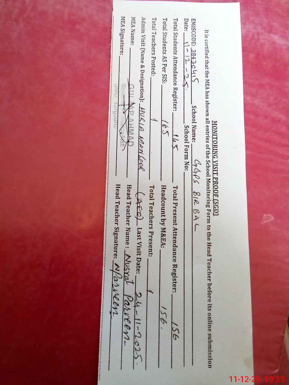 | Attendance Register | Head Teacher | MEA with School | Visit Proof |