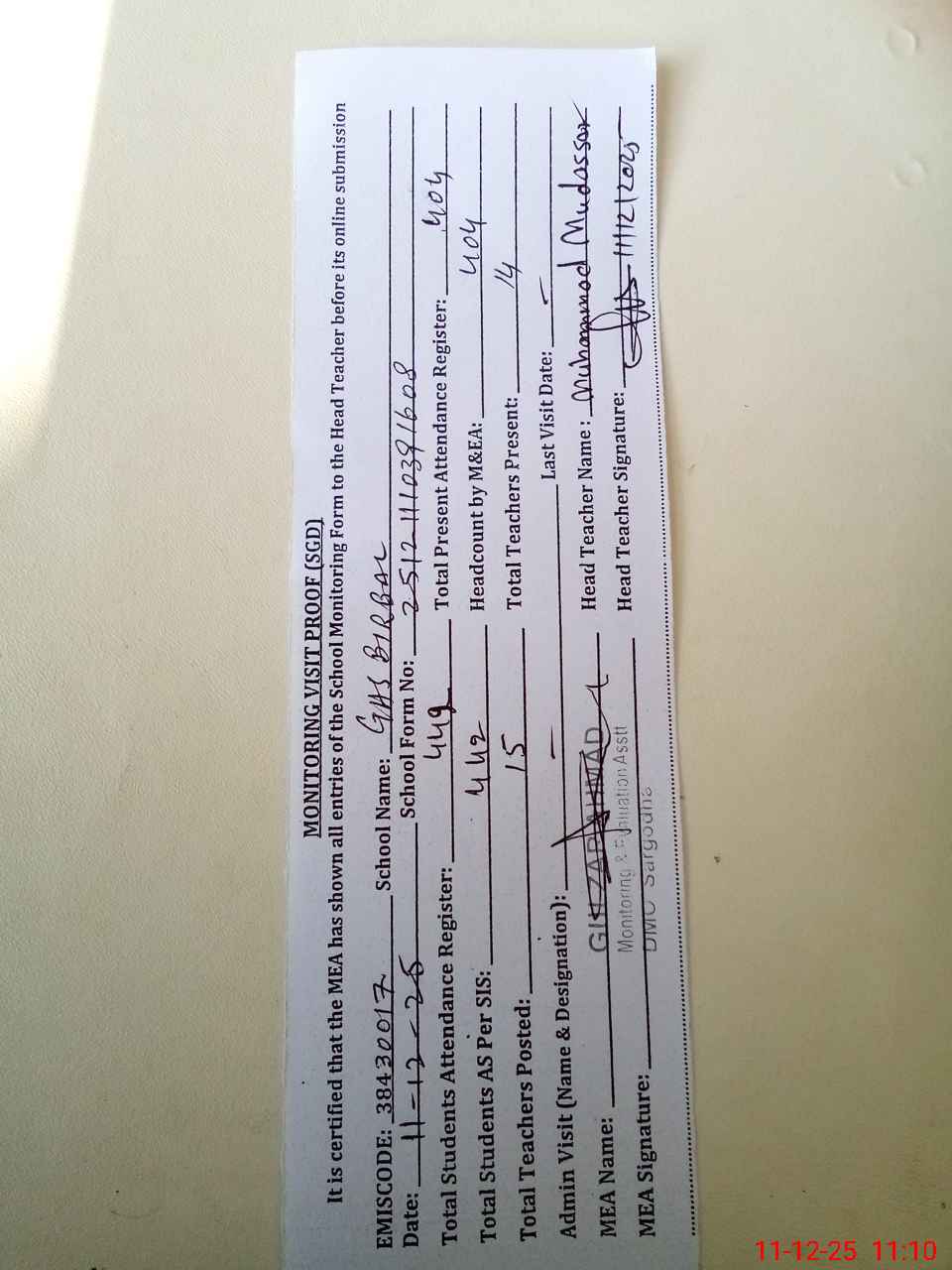 | Attendance Register | Head Teacher | MEA with School | Visit Proof |