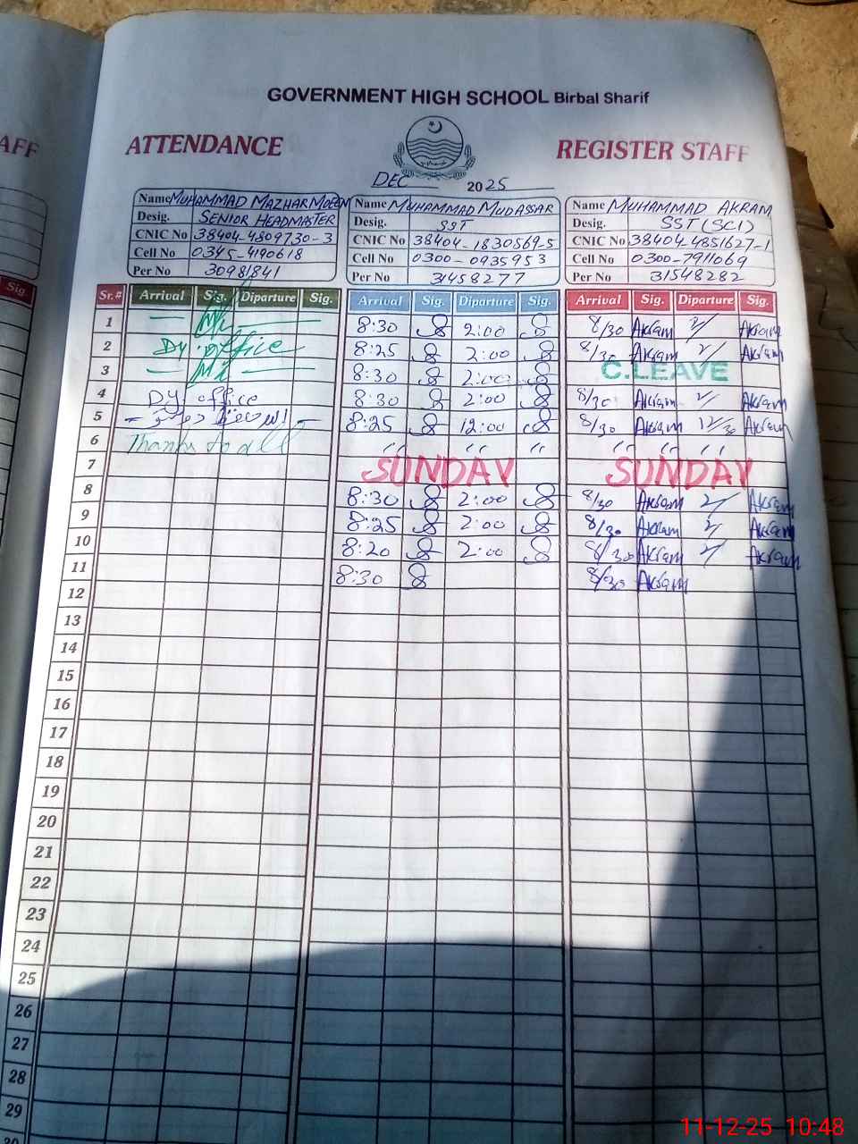 | CNIC | Full Name | Designation | R/C | Absence during last cal. month |