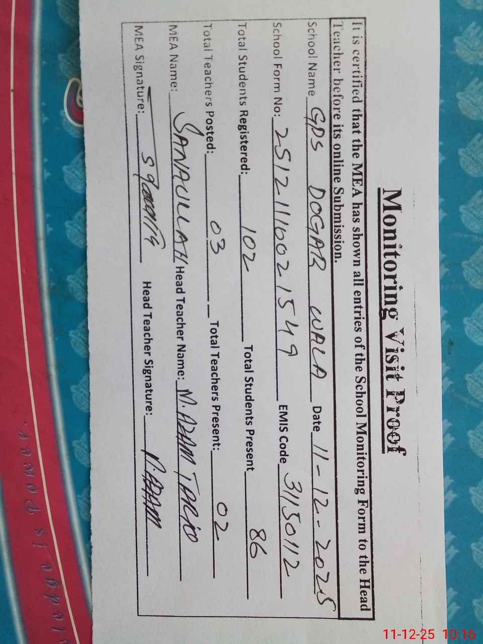 | EMIS Code: 31150112 | Name of School: GPS DOGAR WALA | |||