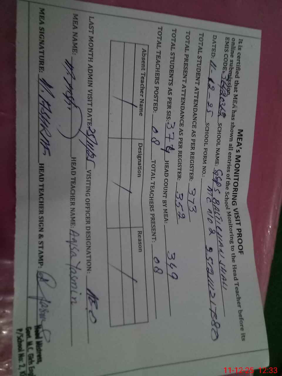 | Attendance Register | Head Teacher | MEA with School | Visit Proof |