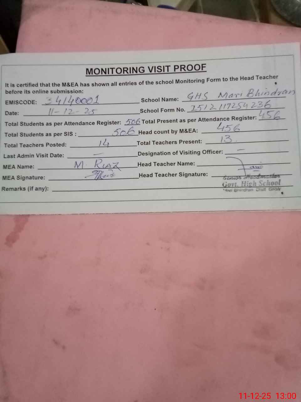 | Attendance Register | Head Teacher | MEA with School | Visit Proof |