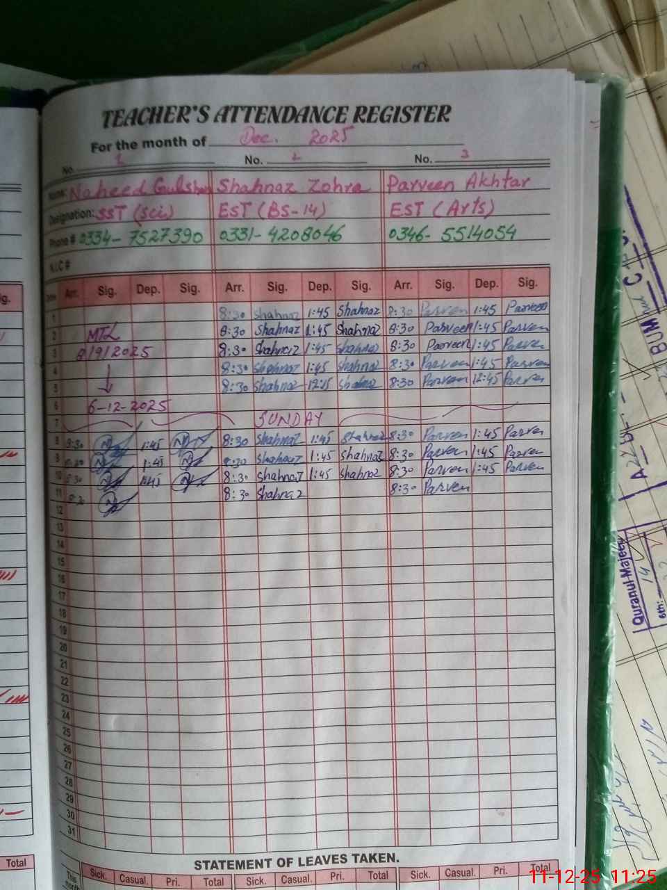 | CNIC | Full Name | Designation | R/C | Absence During Last Calender Month |