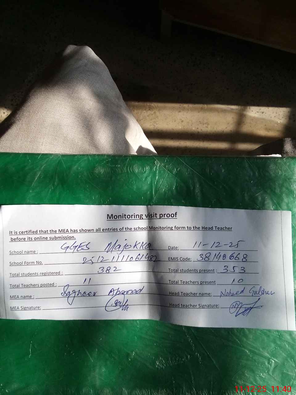 | Attendance Register | Head Teacher | MEA with School | Visit Proof |
