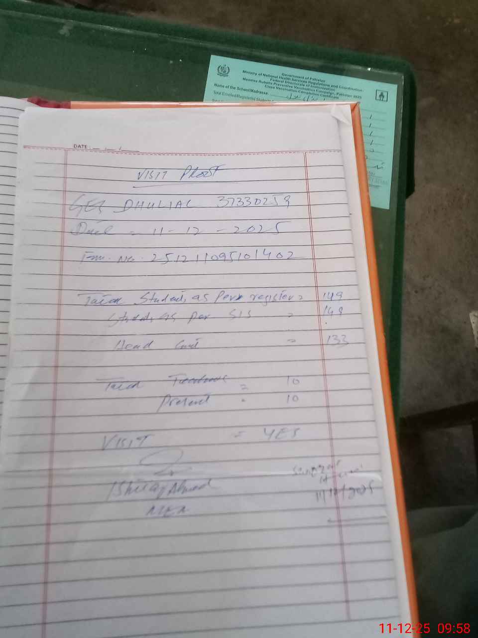 | Attendance Register | Head Teacher | MEA with School | Visit Proof |