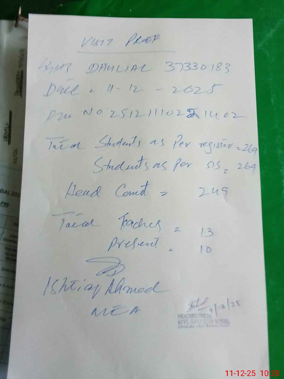 | Attendance Register | Head Teacher | MEA with School | Visit Proof |