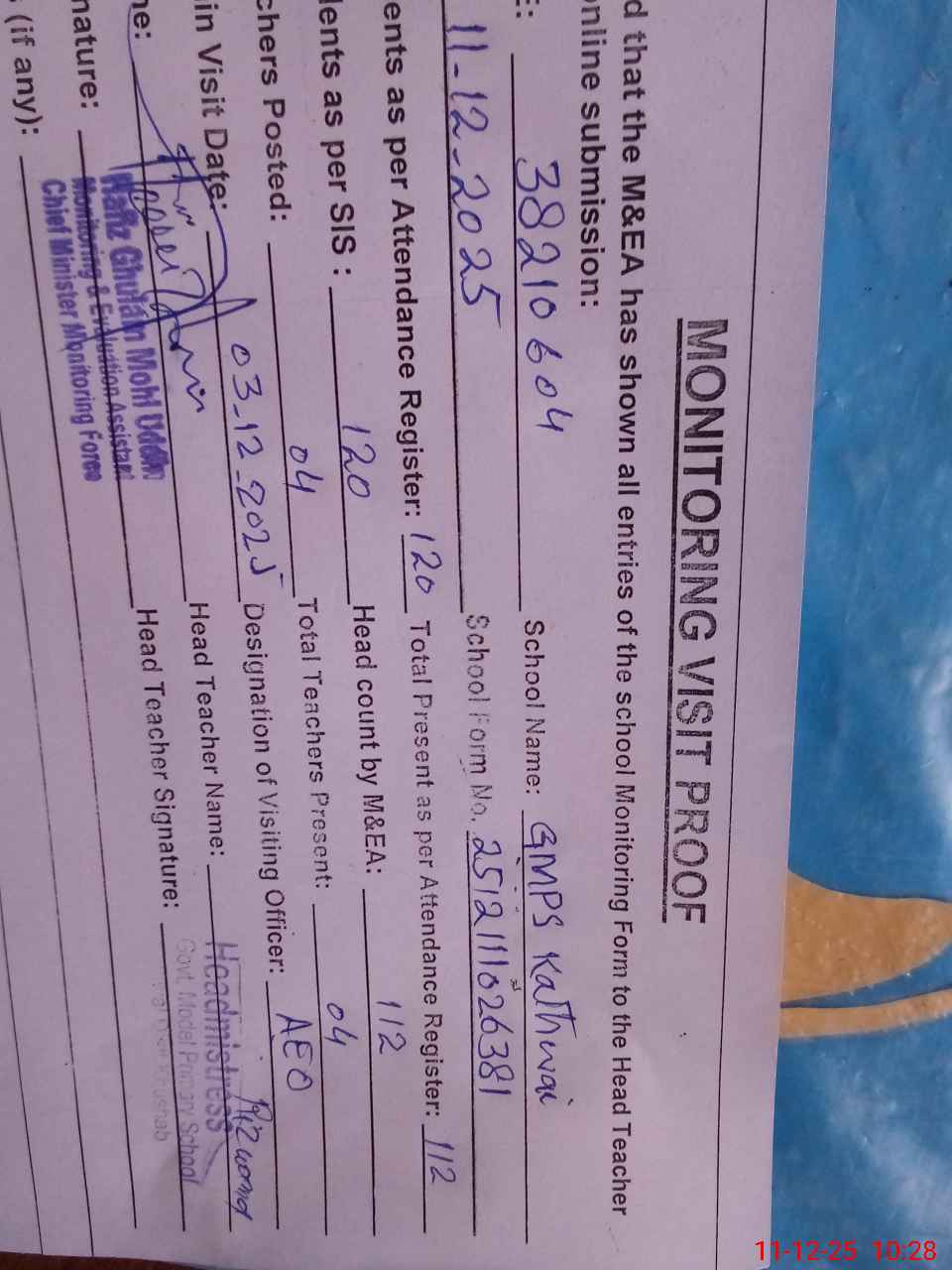 | Attendance Register | Head Teacher | MEA with School | Visit Proof |
