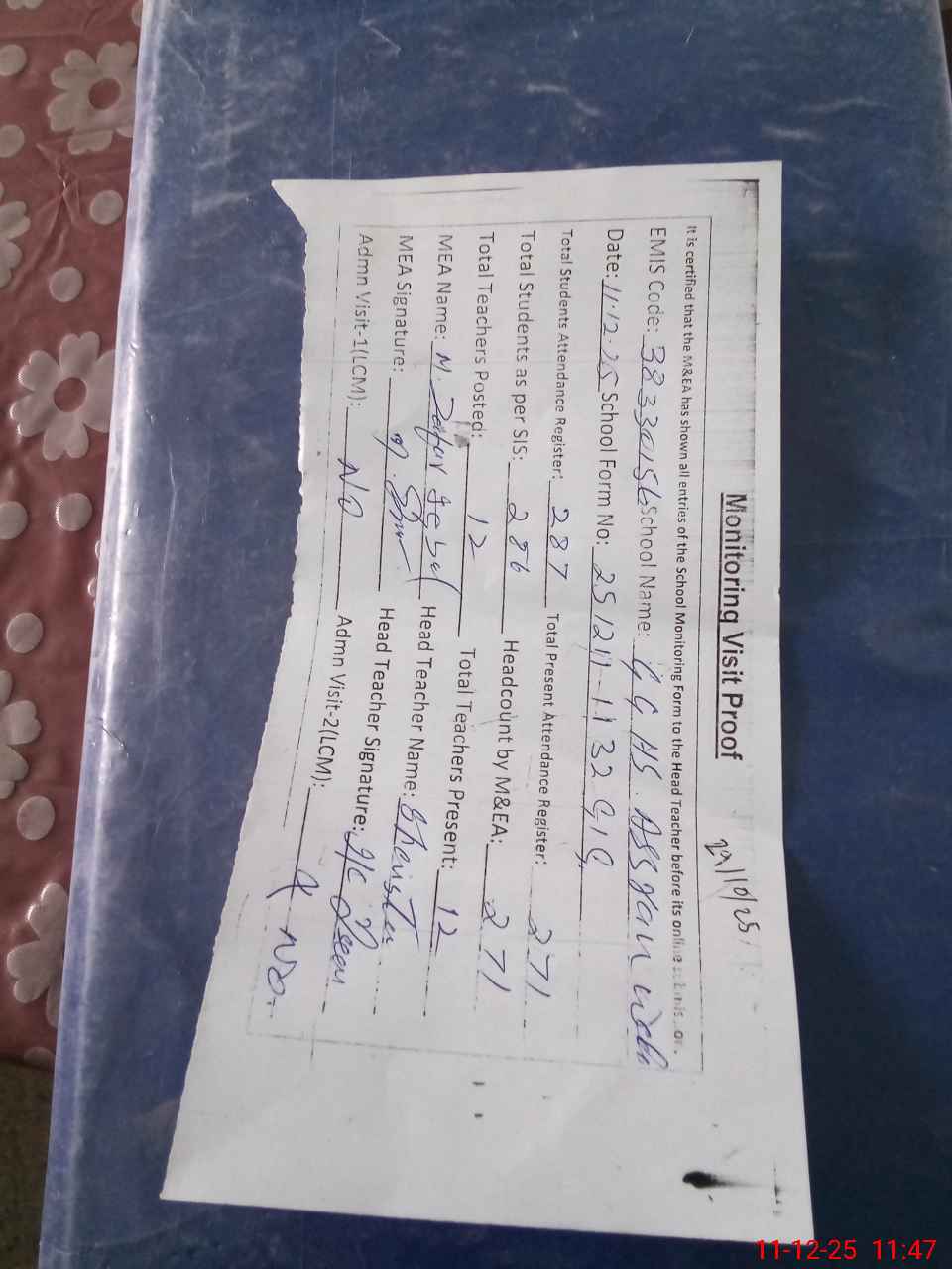 | Attendance Register | Head Teacher | MEA with School | Visit Proof |