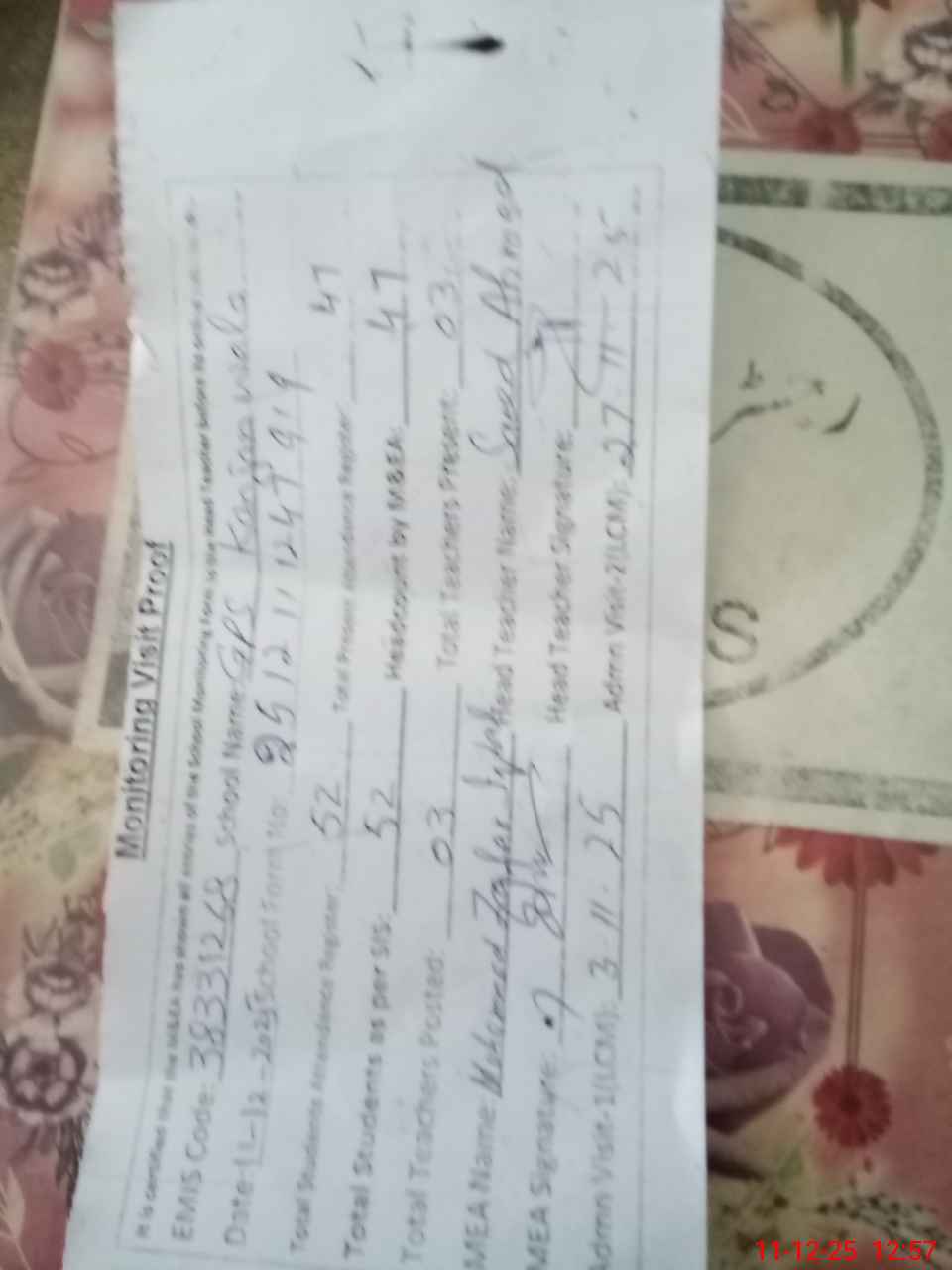 | Attendance Register | Head Teacher | MEA with School | Visit Proof |