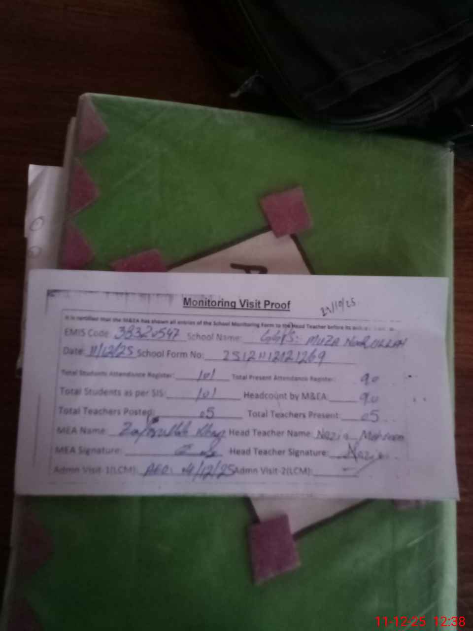 | Attendance Register | Head Teacher | MEA with School | Visit Proof |