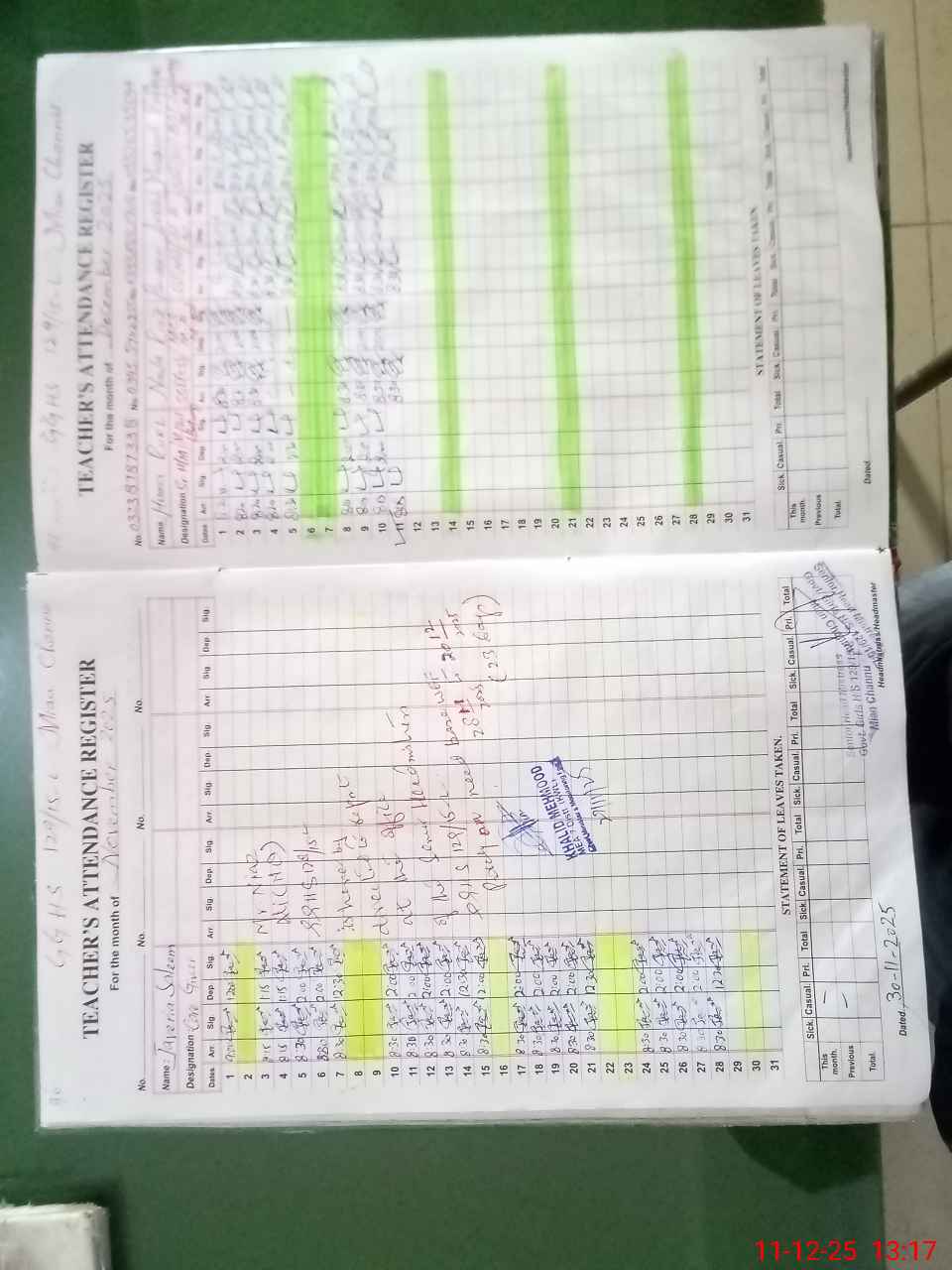 | CNIC | Full Name | Designation | R/C | Absence During Last Calender Month |