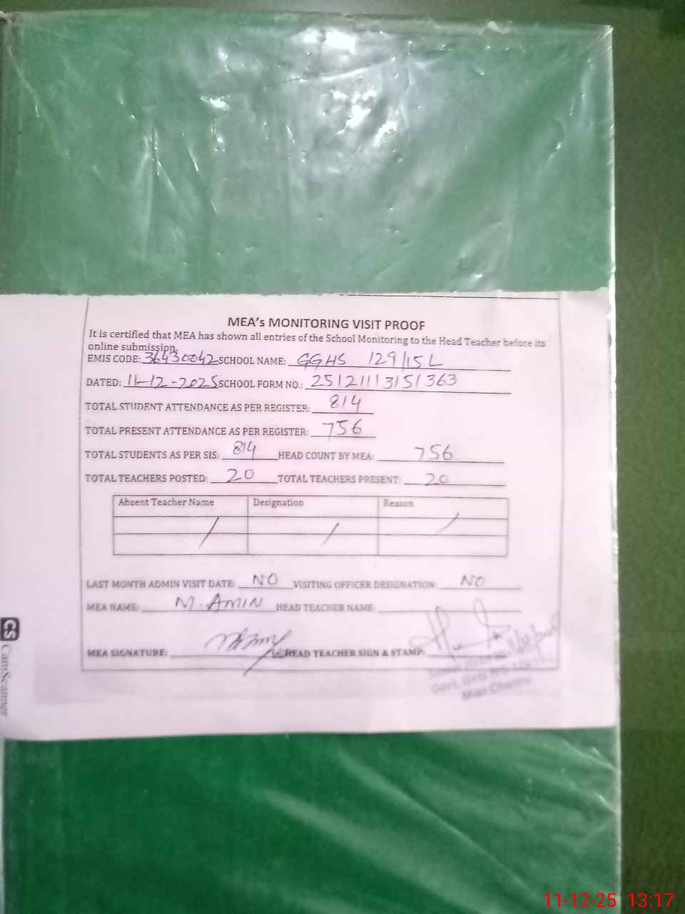 | Attendance Register | Head Teacher | MEA with School | Visit Proof |