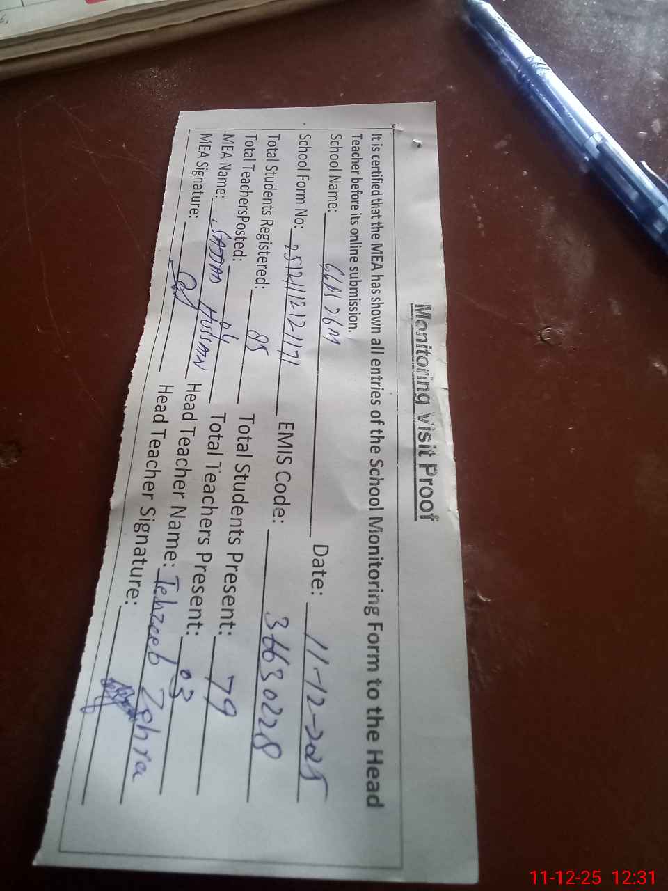 | Attendance Register | Head Teacher | MEA with School | Visit Proof |