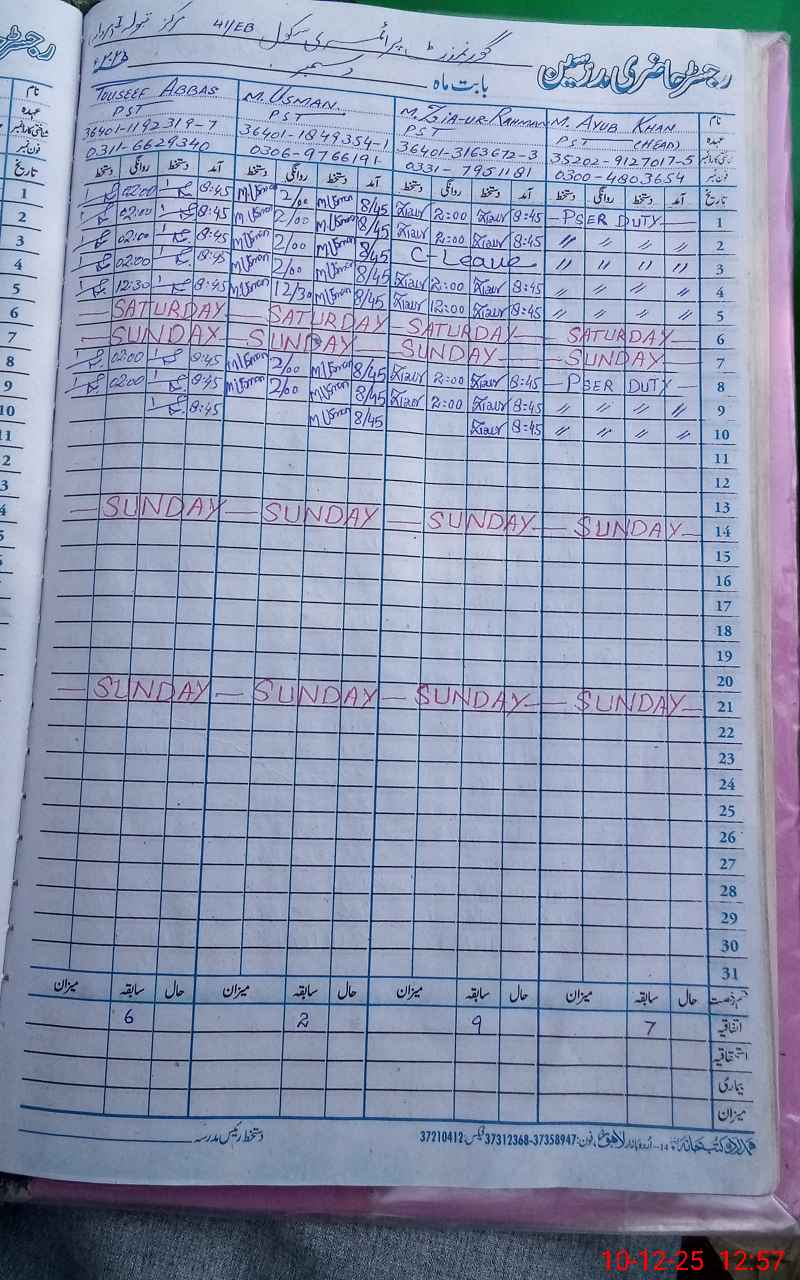 | CNIC | Full Name | Designation | R/C | Absence During Last Calender Month |