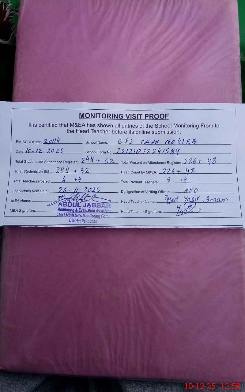 | EMIS Code: 39220114 | Name of School: GPS CHAK NO. 41 EB | |||