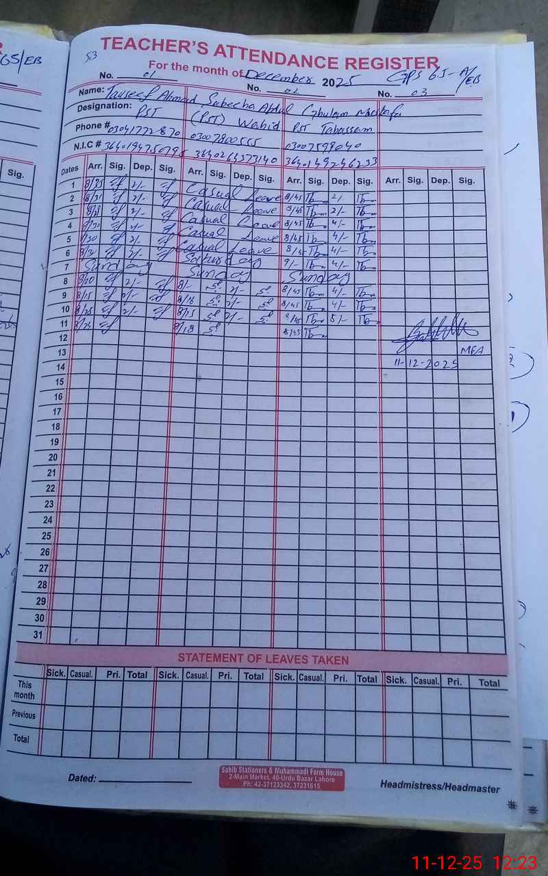 | Name: TA**** AH**** Designation: (School Headmaster's/Headmistress's) PST Phone/Cell Number: 03**** |