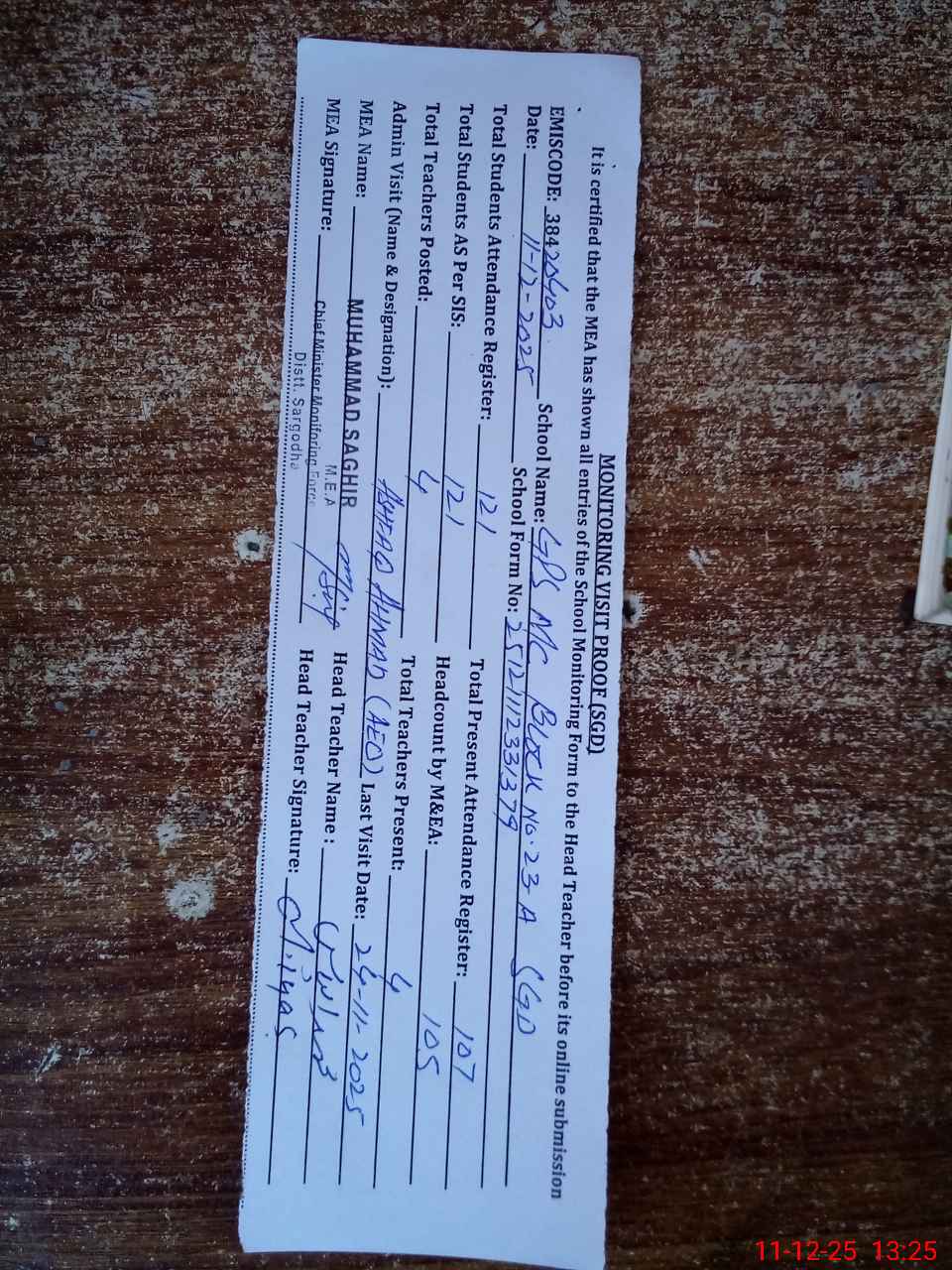 | EMIS Code: 38420403 | Name of School: GPS MC BLOCK NO.23-A SARGODHA | |||