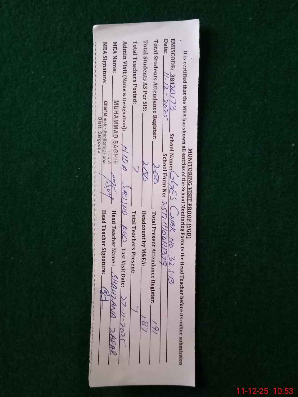 | Monitoring Date: 11-12-2025 | Start Time: 11-12-2025 10:08 AM | End Time: 11-12-2025 10:56 AM | Name of MEA: MU**** SA**** | |