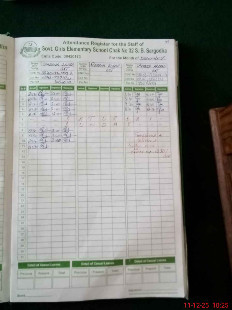 | CNIC | Full Name | Designation | R/C | Absence During Last Calender Month |