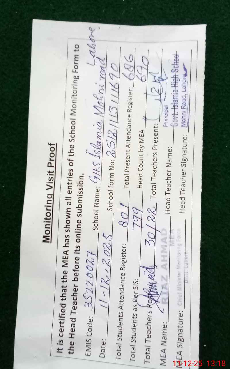 | EMIS Code: 35220027 | Name of School: GHS ISLAMIA MOHNI ROAD | |||