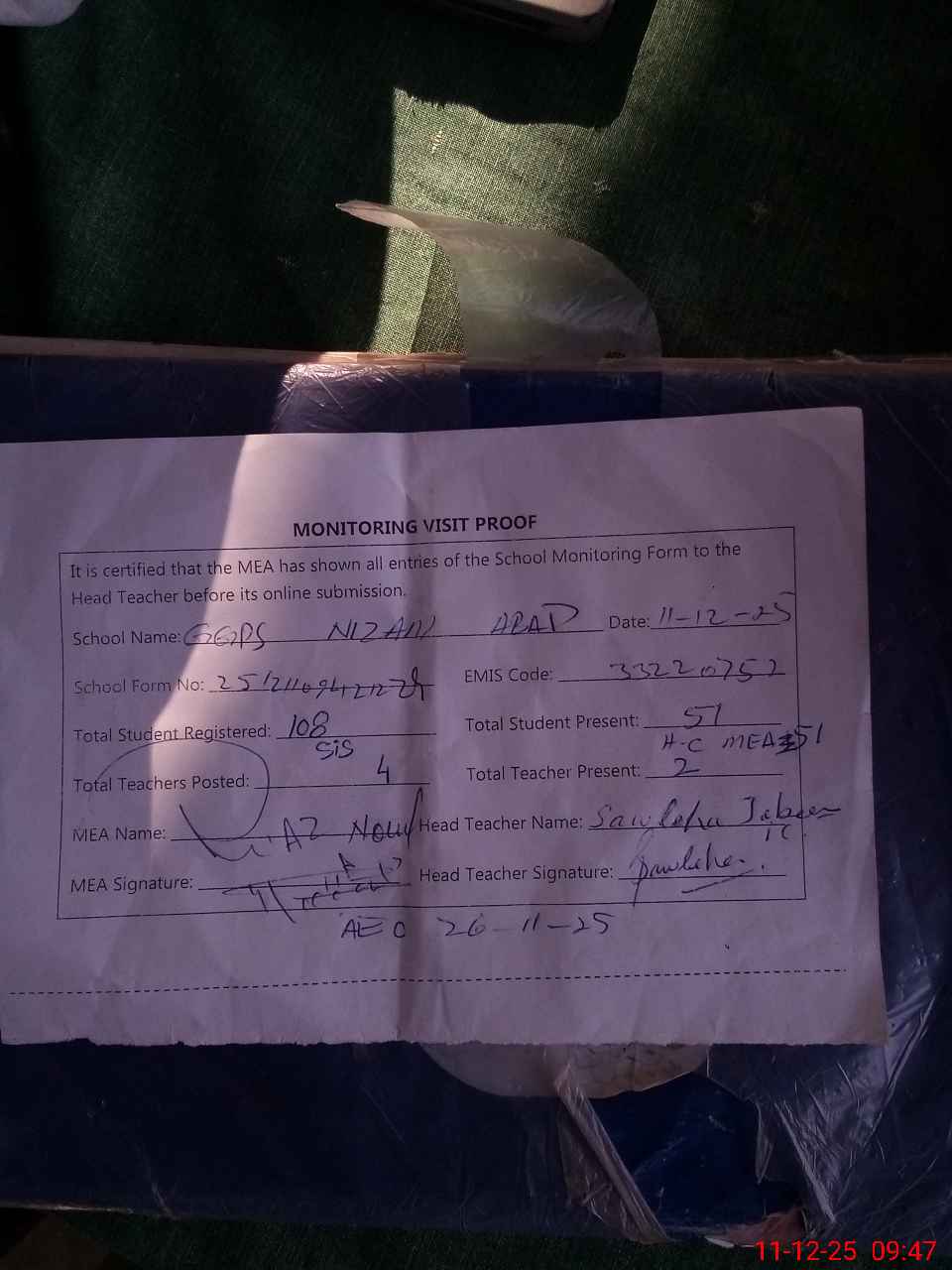 | Attendance Register | Head Teacher | MEA with School | Visit Proof |