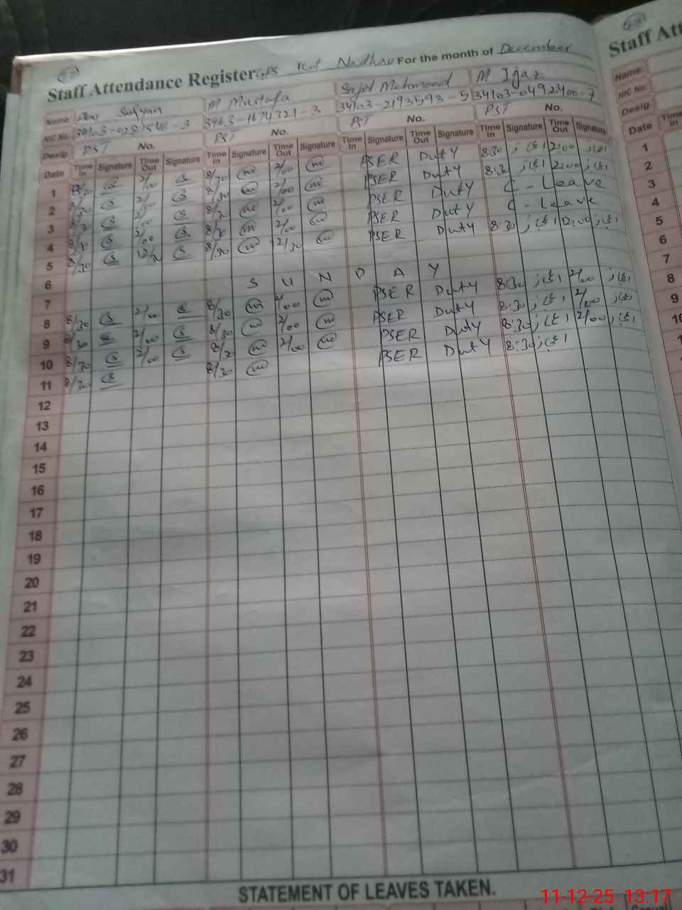 | CNIC | Full Name | Designation | R/C | Absence During Last Calender Month |