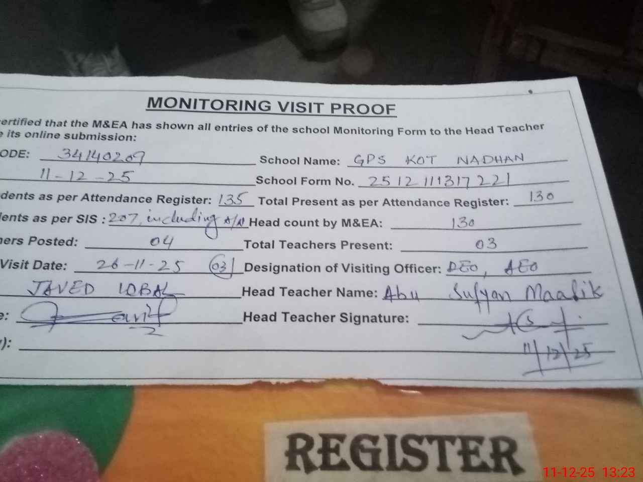| Attendance Register | Head Teacher | MEA with School | Visit Proof |