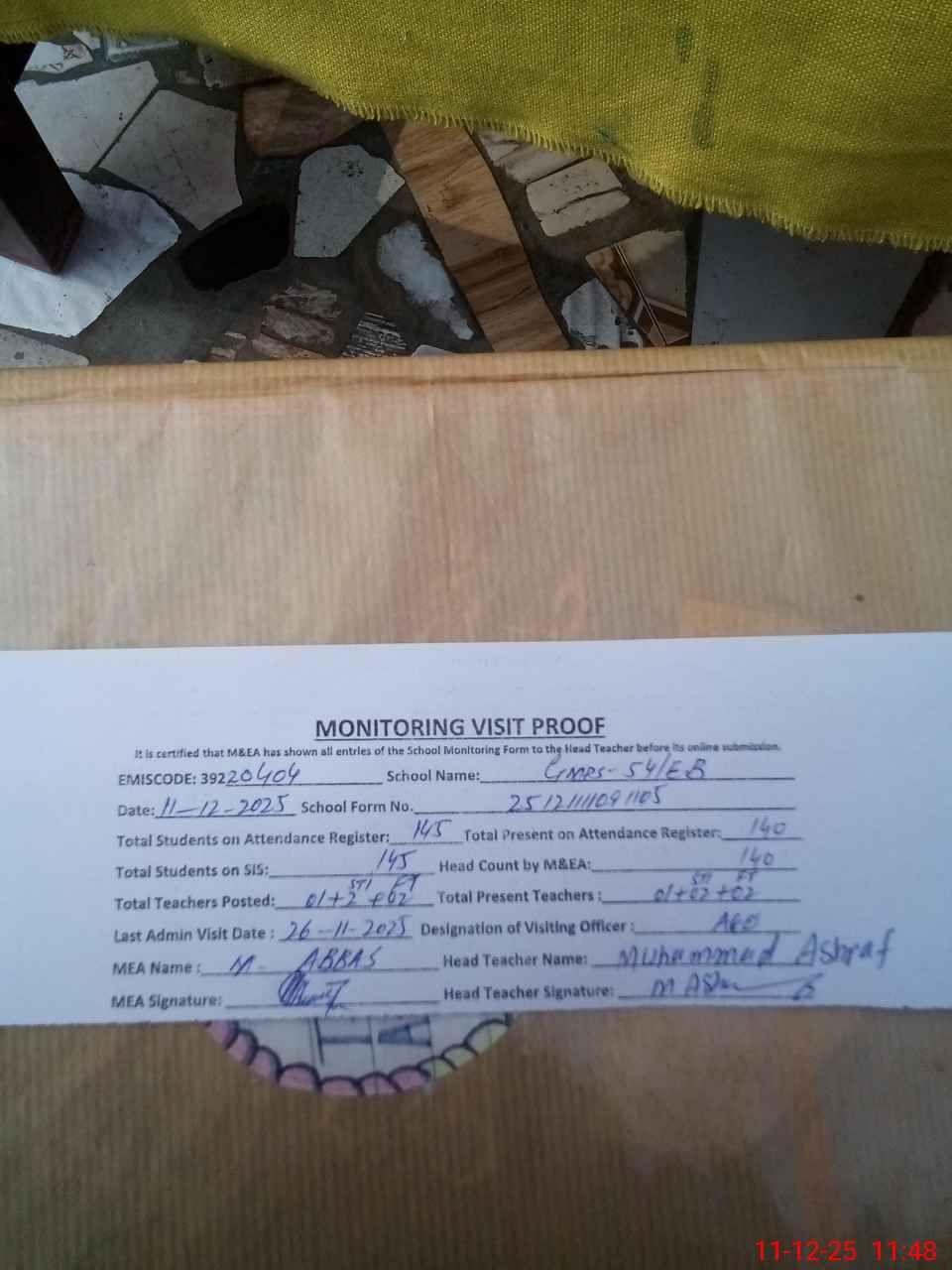 | Attendance Register | Head Teacher | MEA with School | Visit Proof |