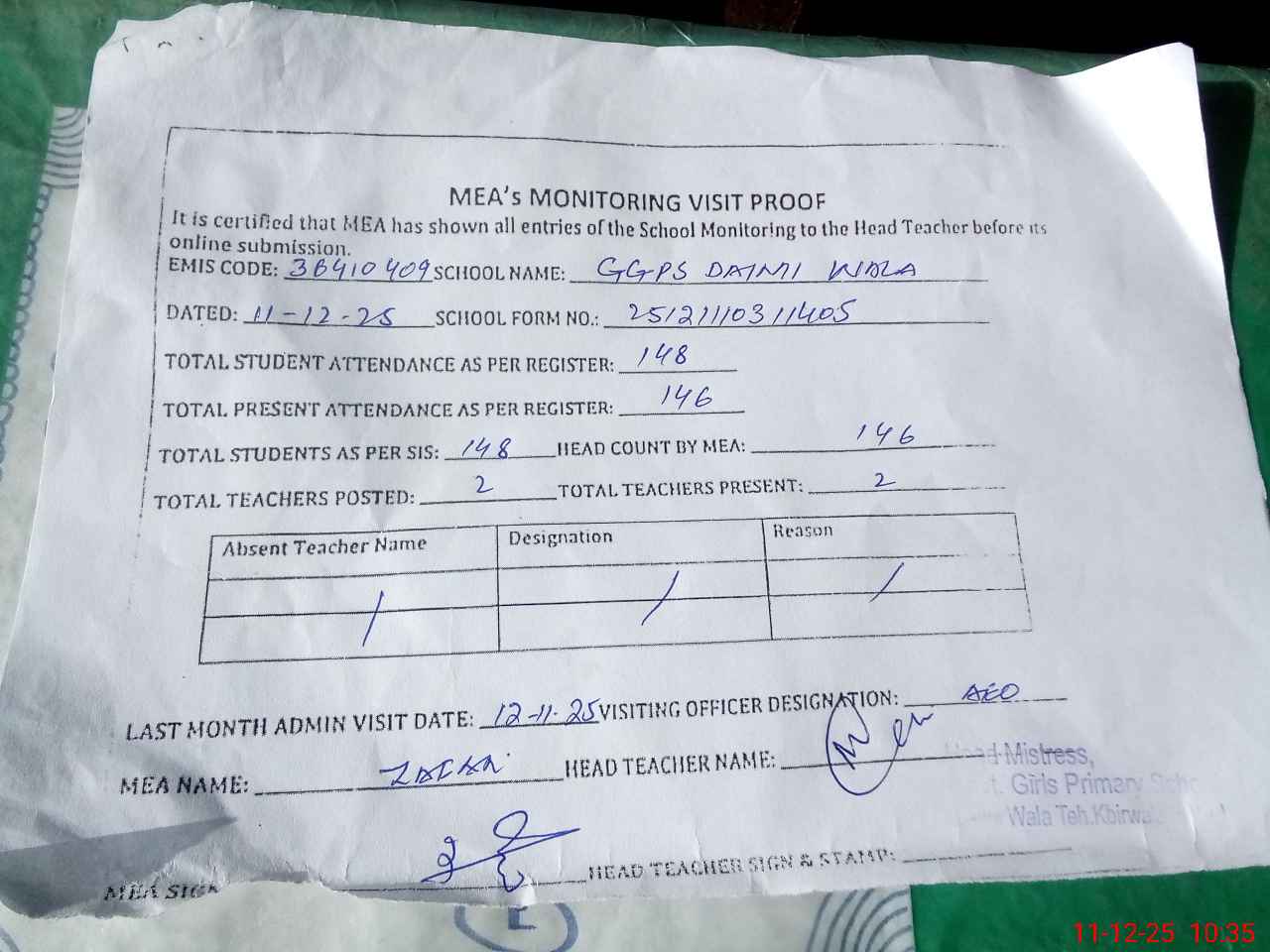 | Attendance Register | Head Teacher | MEA with School | Visit Proof |