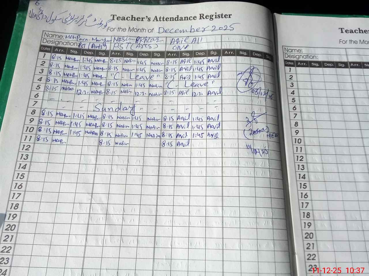 | CNIC | Full Name | Designation | R/C | Absence During Last Calender Month |