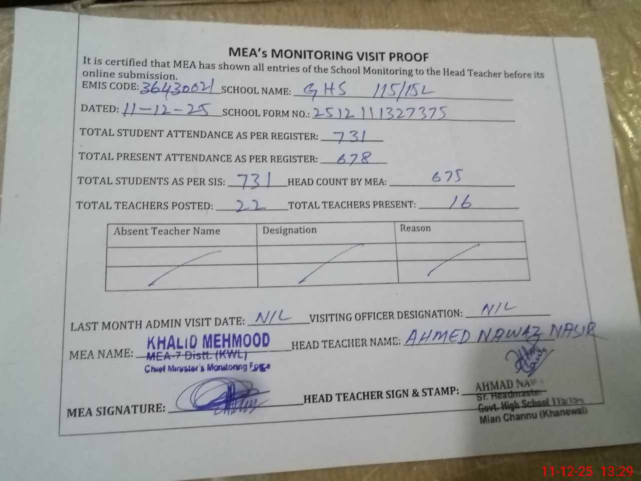 | Attendance Register | Head Teacher | MEA with School | Visit Proof |