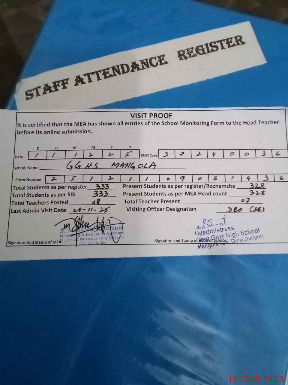 | Attendance Register | Head Teacher | MEA with School | Visit Proof |