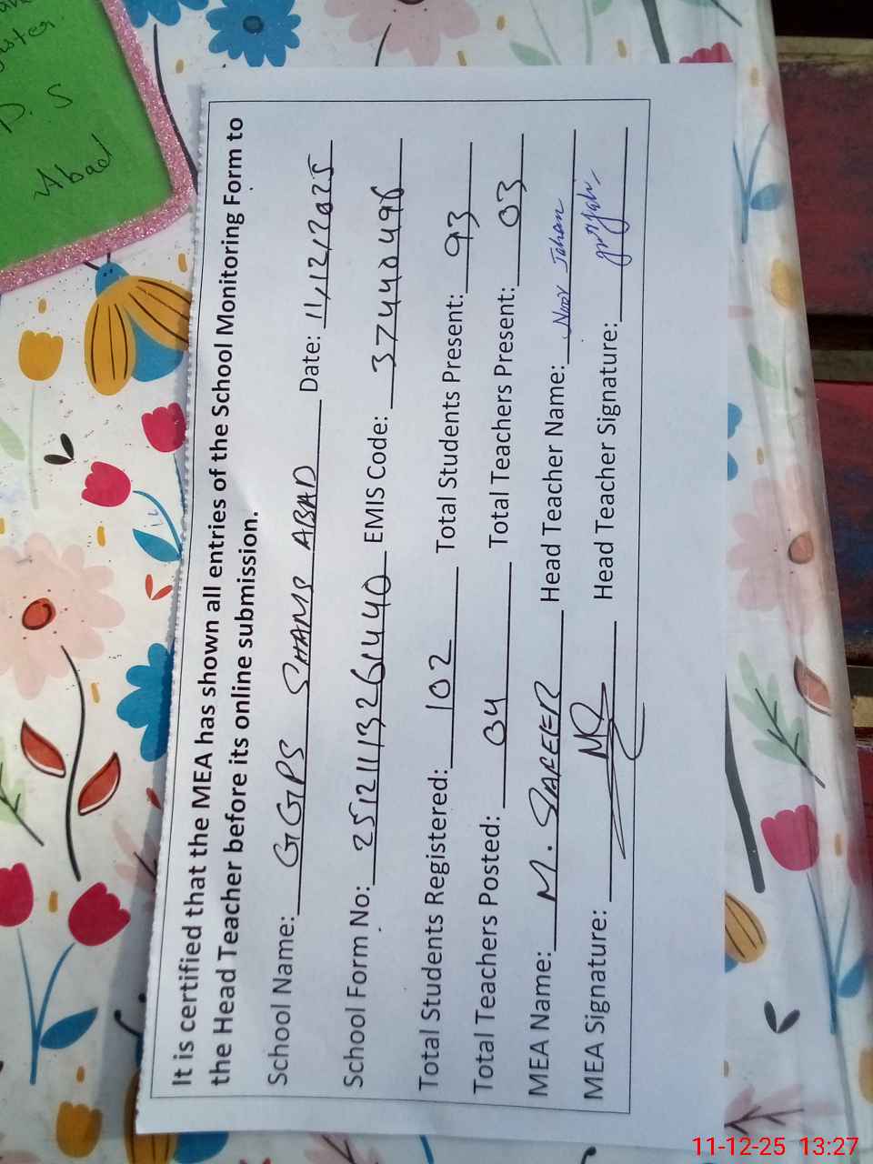 | Attendance Register | Head Teacher | MEA with School | Visit Proof |