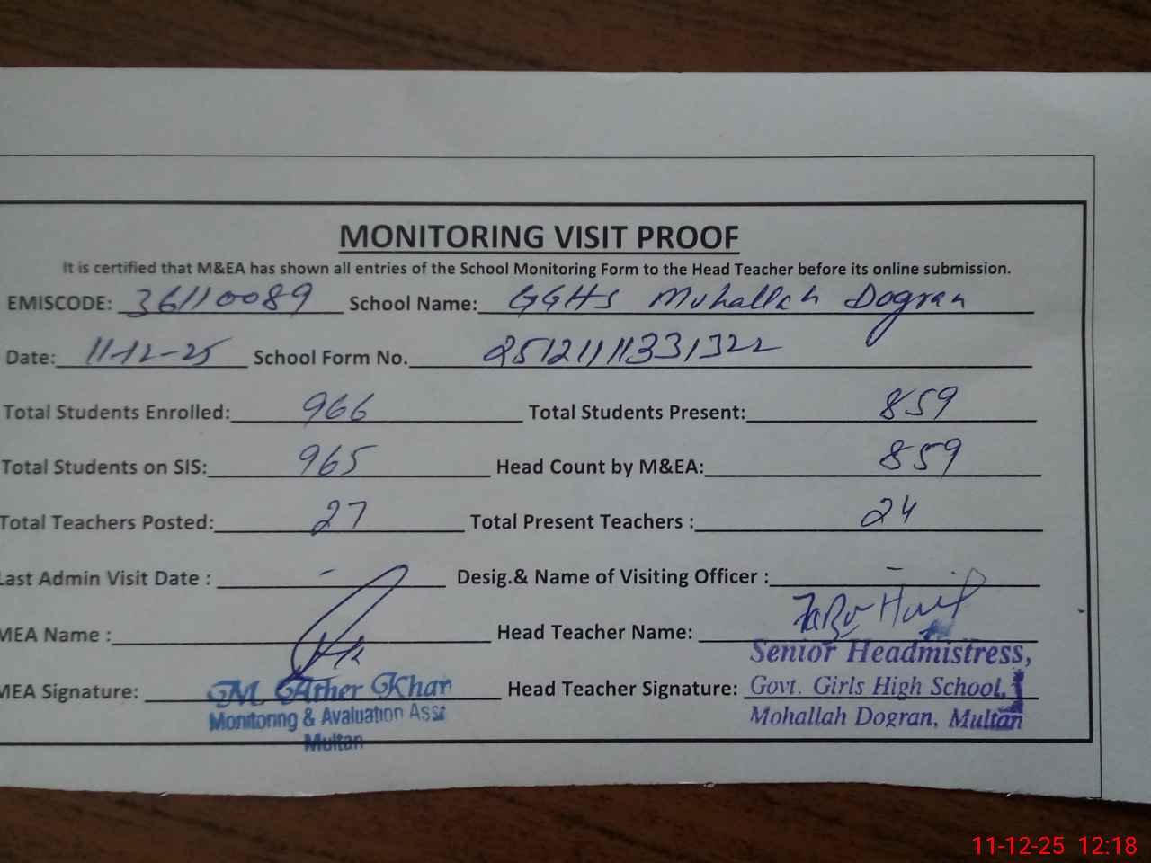 | Attendance Register | Head Teacher | MEA with School | Visit Proof |